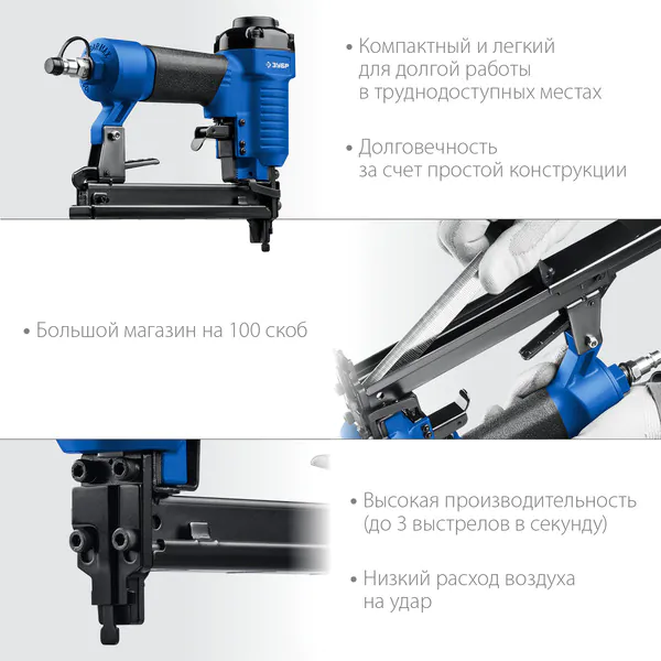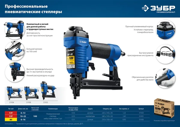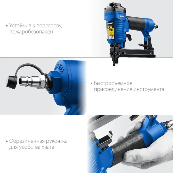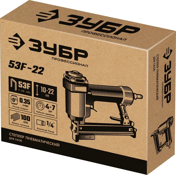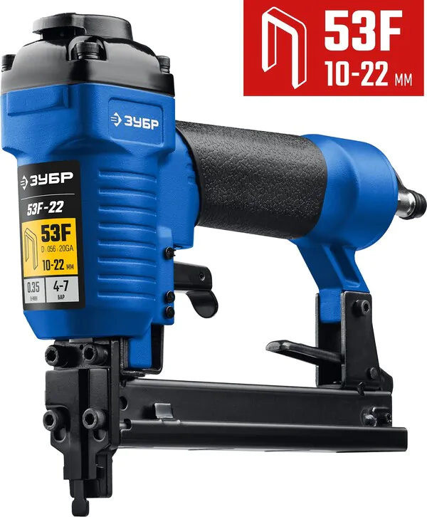 - ЗУБР 53F-22, пневматический степлер для скоб 20Ga, тип 53F (10-22 мм), Профессионал (31935)