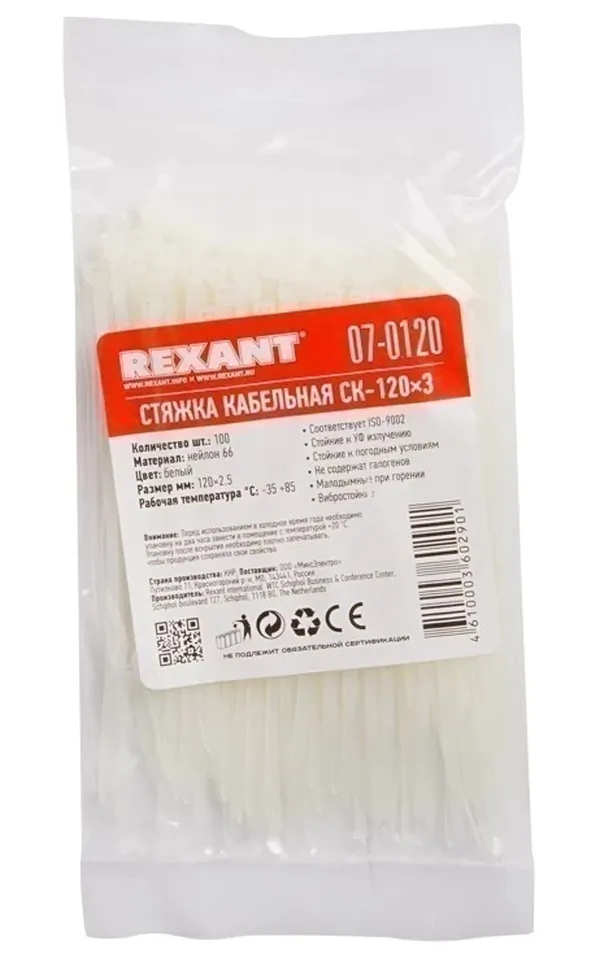 - • стяжки нейлоновые REXANT 120x2,5 мм, белая (100 шт/уп) 07-0120.