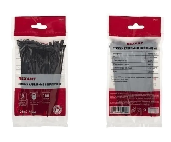 - • стяжки нейлоновые REXANT 120x2,5 мм, черная (100 шт/уп) 07-0121.