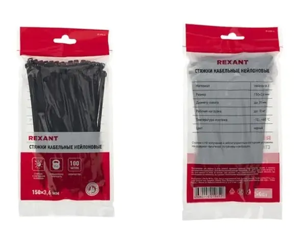 - • стяжки нейлоновые REXANT 150x3,6 мм, черная (100 шт/уп) 07-0151-4.