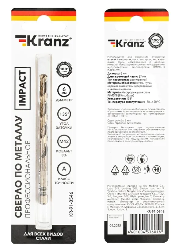 - • сверло по металлу KRANZ 6 мм «Кобальт IMPACT» P6M5K8 DIN 338, шестигранный хвостовик, KR-91-0546.