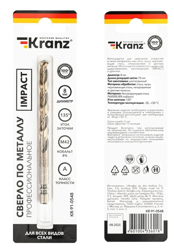 - • сверло по металлу KRANZ 8 мм «Кобальт IMPACT» P6M5K8 DIN 338, шестигранный хвостовик, KR-91-0548.