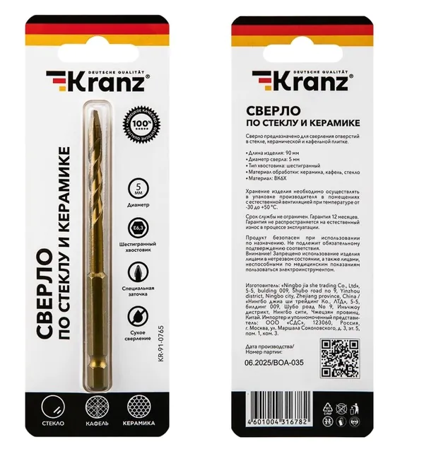 Сверло по стеклу и керамике KRANZ сухое сверление, 5мм, шестигранный хвостовик KR-91-0765