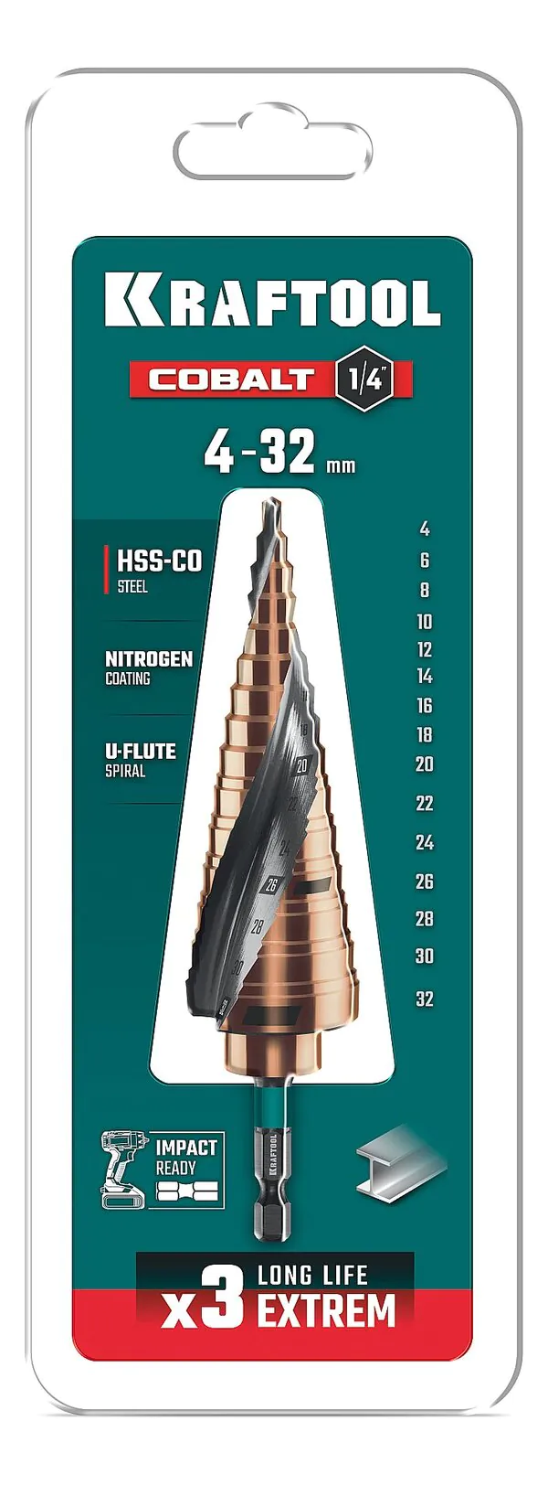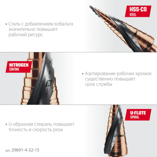 - KRAFTOOL COBALT 4-32мм, 15 ступеней, азотирование, винтовая спираль, сверло ступенчатое(29691-4-32-15)