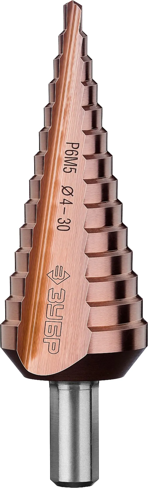 - ЗУБР Кобальт, 4-30 мм, 14 ступеней, сталь Р6М5, кобальтовое покрытие, ступенчатое сверло, Профессионал (29672-4-30-14) 29672-4-30-14_z01