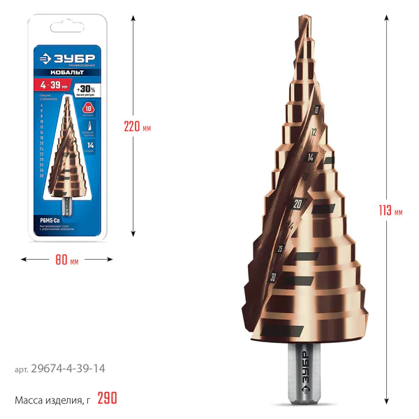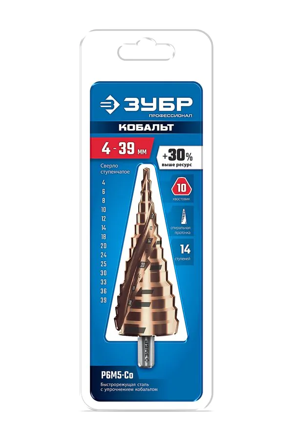- ЗУБР КОБАЛЬТ 4-39мм, 14 ступеней, винтовая проточка, сверло ступенчатое, серия Профессионал(29674-4-39-14)