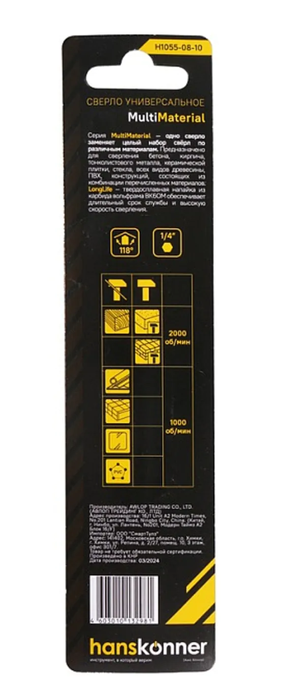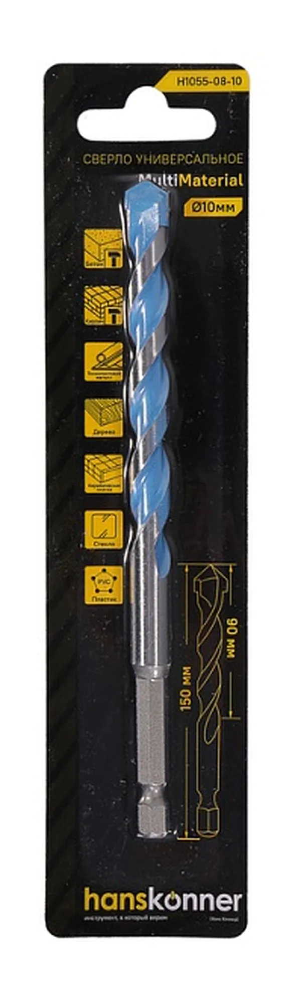 - • сверло универсальное Hanskonner, 10мм, твердосплавная напайка, шестигр. хвостовик, H1055-08-10.