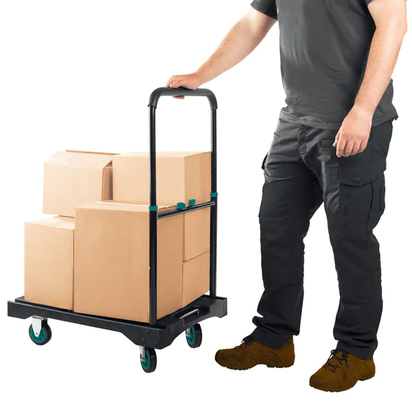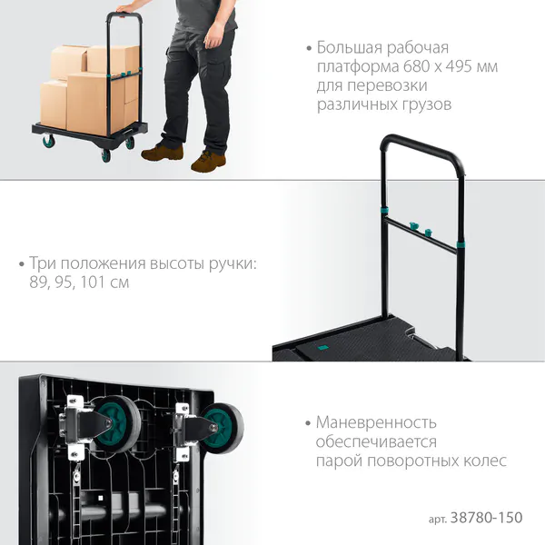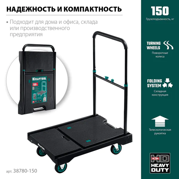 - KRAFTOOL до 150 кг, платформа 68.0 х 49.5 см, складная рукоятка, складные колеса d 10 см, вес - 9.3 кг, платформенная тележка (38780-150)