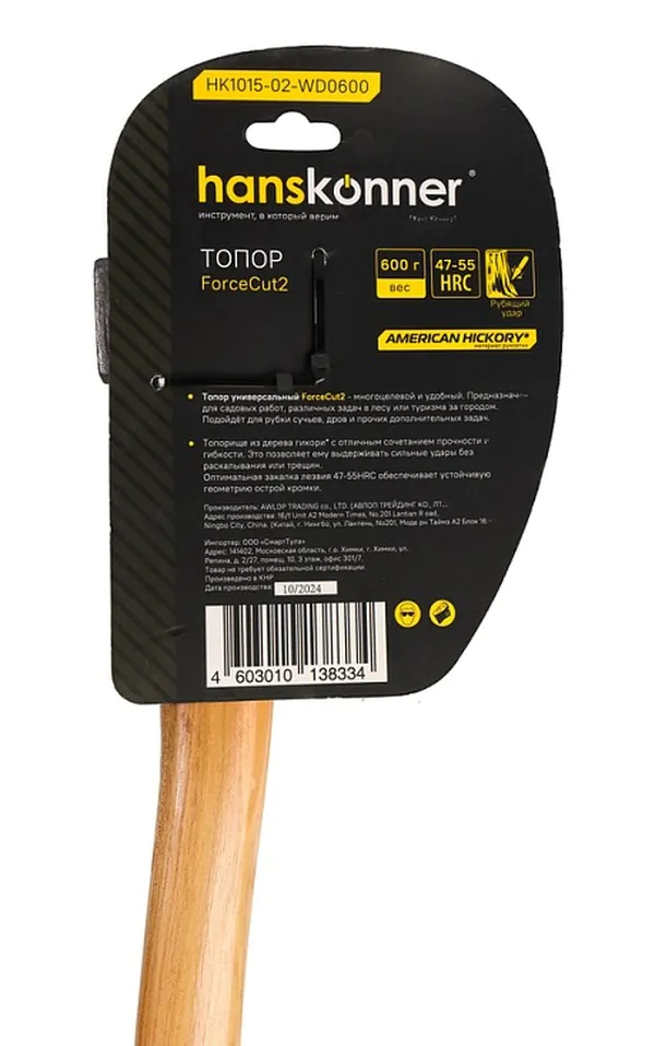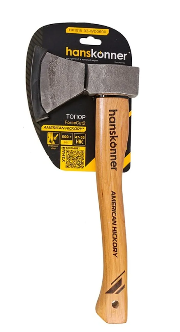 - • топор деревянный Hanskonner 600г, длина рукоятки 360 мм, рукоятка гикори, HK1015-02-WD0600.
