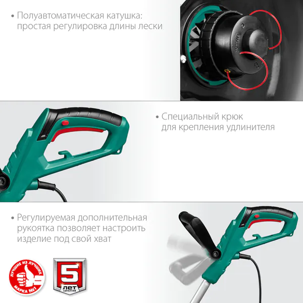 Ширина скашивания для лески, ммШирина скашивания для ножа, ммРежущий элементРегулируемая штангаДаУсловия гарантии60 месяцевТолщина лески, ммС ремешкомНетЕврокатушкаТип ручкиЧастота вращения шпинделя, об/мин11000Длина кабеля, м0.45Крепление триммерной головкиНапряжение питания, ВMax мощность, Вт400УпаковкаГабариты товара (ДхШхВ), мм755*195*90Масса нетто, кг2.23Комплектация