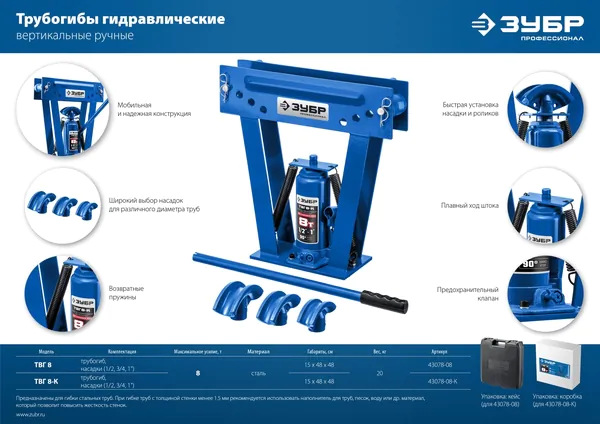 - ЗУБР ТГВ-8-K, 8 т, ручной вертикальный гидравлический трубогиб в кейсе, Профессионал (43078-08-K) 43078-08-K_z01