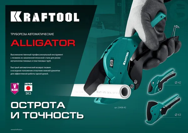 - KRAFTOOL Alligator-63, до 63 мм, автоматический труборез по металлопластиковым и пластиковым трубам (23408-63) 23408-63_z01