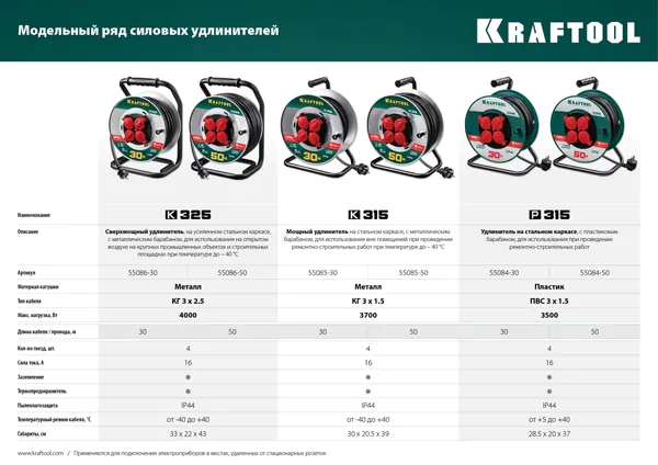 - KRAFTOOL K-325, КГ, 3 х 2.5 мм2, 50 м, 4000 Вт, IP44, силовой удлинитель на стальной катушке (55086-50)