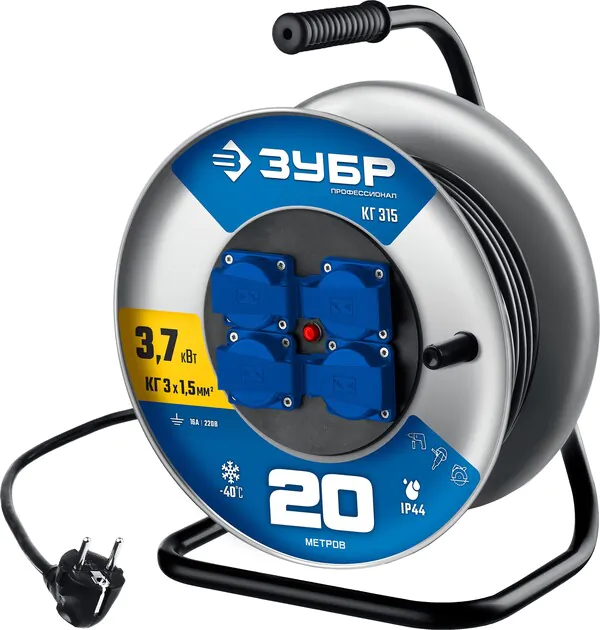 - ЗУБР КГ-315, КГ, 3 x 1.5 мм2, 20 м, 3700 Вт, IP44, силовой удлинитель на стальной катушке, Профессионал (55080-20) 55080-20_z01