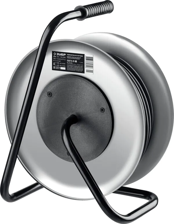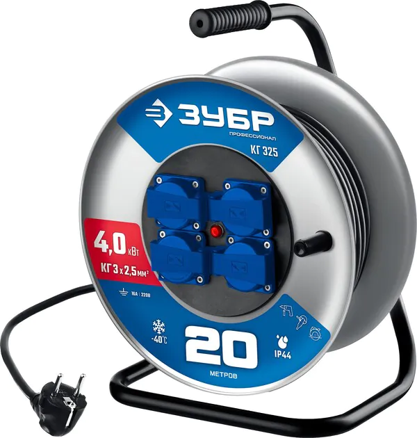 - ЗУБР КГ-325, КГ, 3 x 2.5 мм2, 20 м, 4000 Вт, IP44, силовой удлинитель на стальной катушке, Профессионал (55079-20) 55079-20_z01