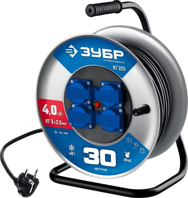 - ЗУБР КГ-325, КГ, 3 x 2.5 мм2, 30 м, 4000 Вт, IP44, силовой удлинитель на стальной катушке, Профессионал (55079-30) 55079-30_z01