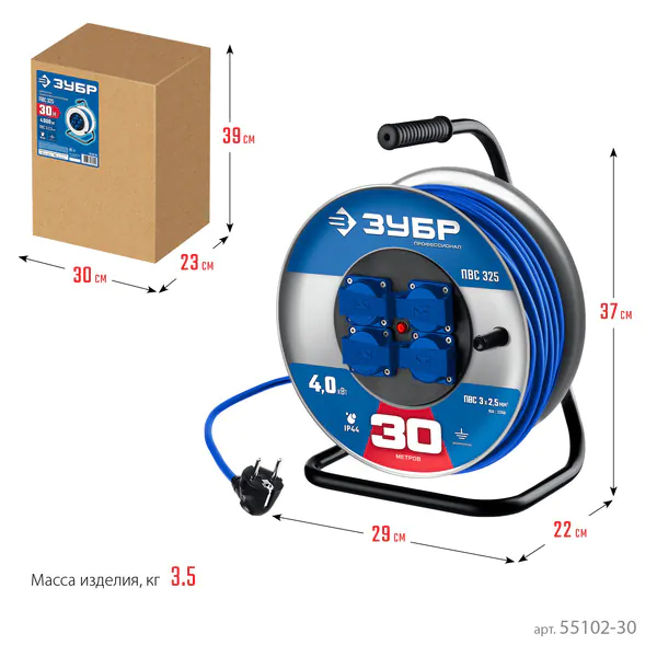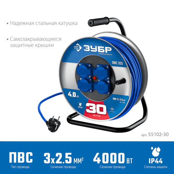 - ЗУБР ПВС-325, ПВС, 3 x 2.5 мм2, 30 м, 4000 Вт, IP44, силовой удлинитель на стальной катушке, Профессионал (55102-30)