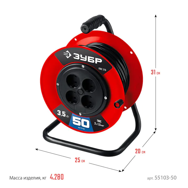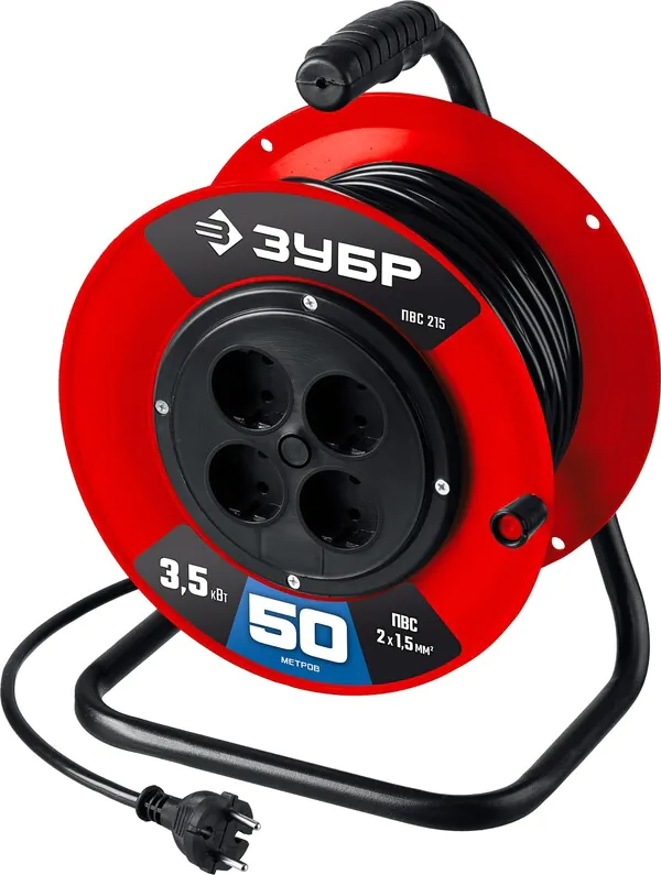 - ЗУБР ПВС-215, ПВС, 2 х 1.5 мм2, 50 м, 3500 Вт, силовой удлинитель на катушке (55103-50)