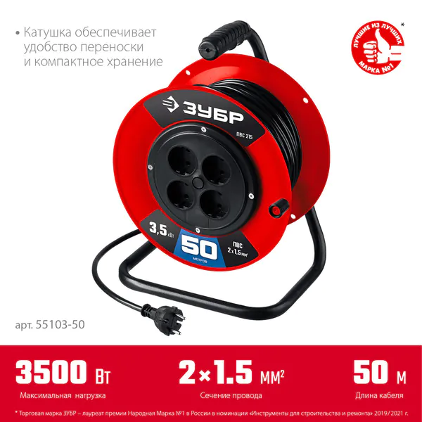 Удлинитель силовой ЗУБР ПВС-215, ПВС, 2 х 1.5 мм2, 50 м, 3500 Вт, на катушке 55103-50