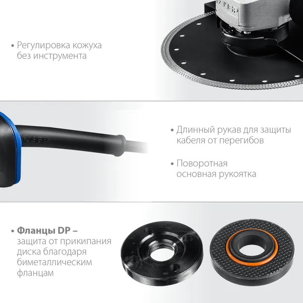 Max мощность, Вт2200Диаметр диска, ммЭлектронная регулировка оборотовНетПлавный пускДаПредохранительная муфтаНетПоддержание постоянных оборотов под нагрузкойНетЗащита от непреднамеренного пускаДаНаличие виброручкиНетБыстрозажимная гайка SDSНетРезьба шпинделяЗащита от перегреваДаСуперфланецДаПосадочный диаметрПоворотная рукояткаДаФункция поворотаДаУпаковкаБоковая рукояткаДаЭлектронная защита от перегрузокНетФиксация куркаДаНапряжение питания, ВУсловия гарантии60 месяцевЧисло оборотов, об/минРегулировка положения кожуха без инструментаДаДлина кабеля, м3Габариты товара (ДхШхВ), мм540*120*120Масса нетто, кг6.9