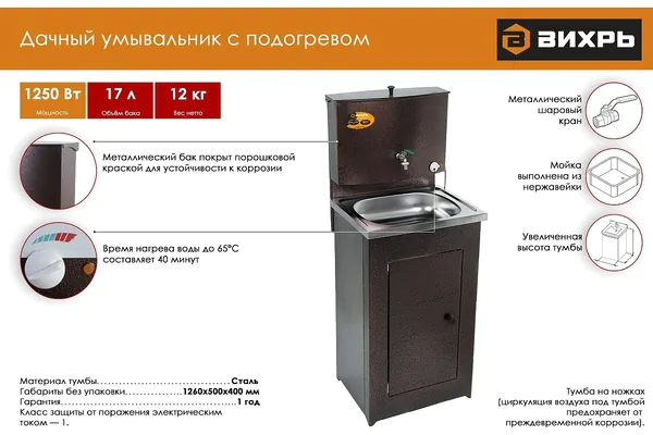 - • умывальник дачный Вихрь ЛЮКС, с подогревом, нержавеющая мойка, цвет медь 74/4/2.