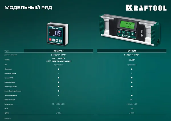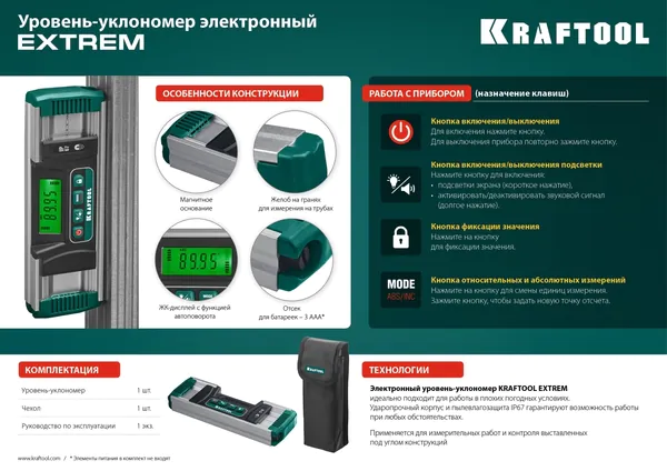 - KRAFTOOL EXTREM, 0 - 360°, точность 0.05°, HOLD, IP67, электронный уровень-уклономер (34686)