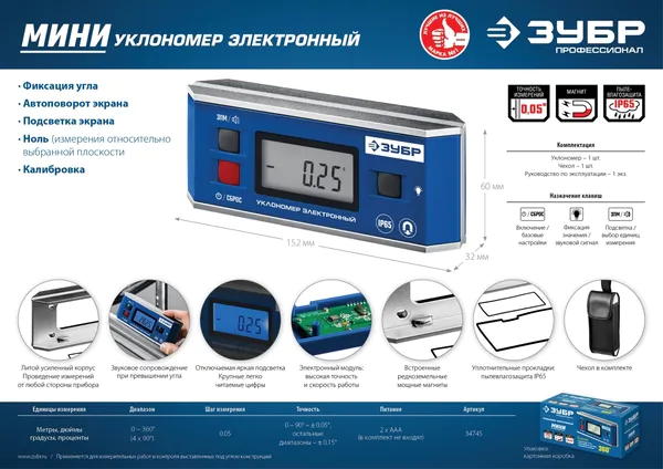 - ЗУБР МИНИ, 0 - 90°, ±0.05°, электронный уровень-уклономер, Профессионал (34745) 34745_z01