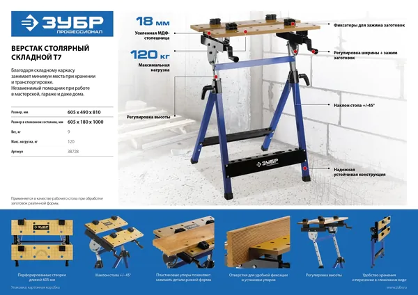 - ЗУБР T7, 605х490х810 мм, складной столярный верстак Профессионал (38728)