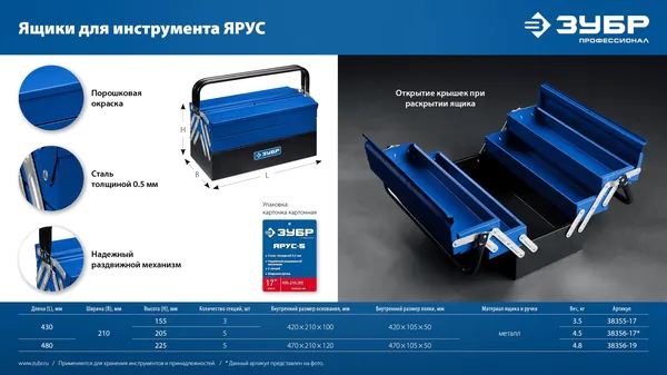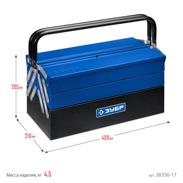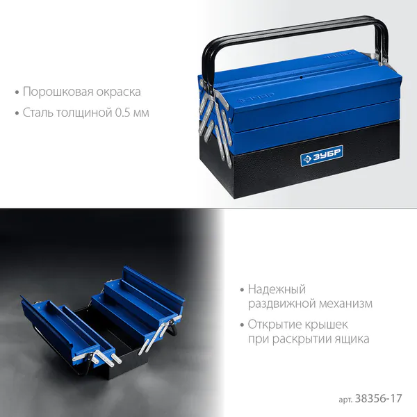 - ЗУБР ЯРУС-5/17, 430 х 210 х 205 мм, (17″), Металлический раздвижной ящик для инструментов, Профессионал (38356-17)
