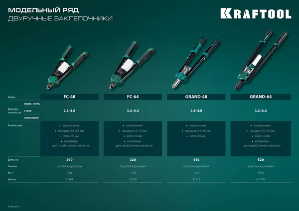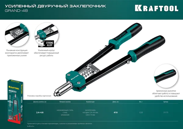 - KRAFTOOL GRAND-48, 2.4 - 4.8 мм, 410 мм, усиленный двуручный заклёпочник (31175)