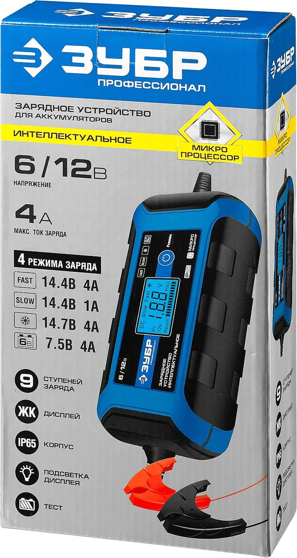 Зарядное устройство ЗУБР Профессионал ЗУ-120, 6/12 В, 4 А, интеллектуальное для аккумуляторов 59300